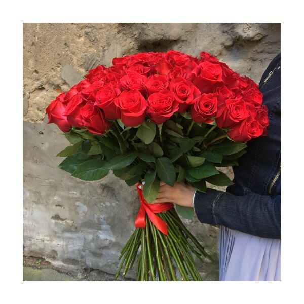 101 красная роза 60 см собрана по спирали и украшена атласной лентой.