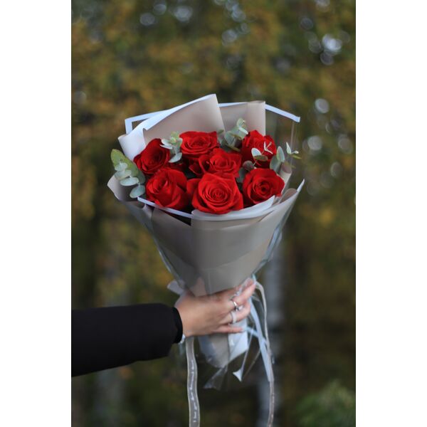 7 красных роз с эвкалиптом, в стильной упаковке. Цвет упаковки можно изменить по вашему желанию.