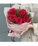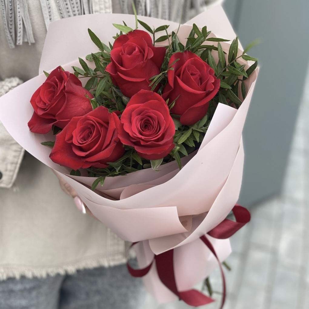 Букет из 5 красных роз, зелени в стильной упаковке.
