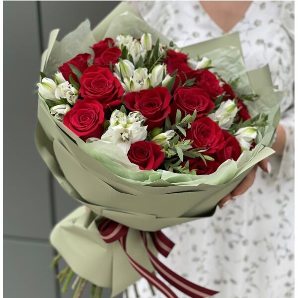 Букет из 15 роз и 10 альстромерии в стильной упаковке.
