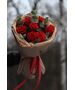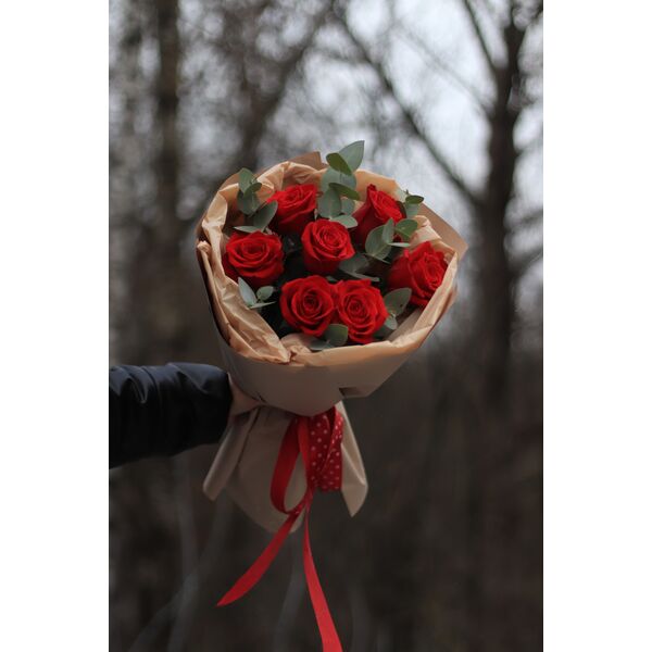 Букет из 7 красных роз, эвкалипта в стильной упаковке.