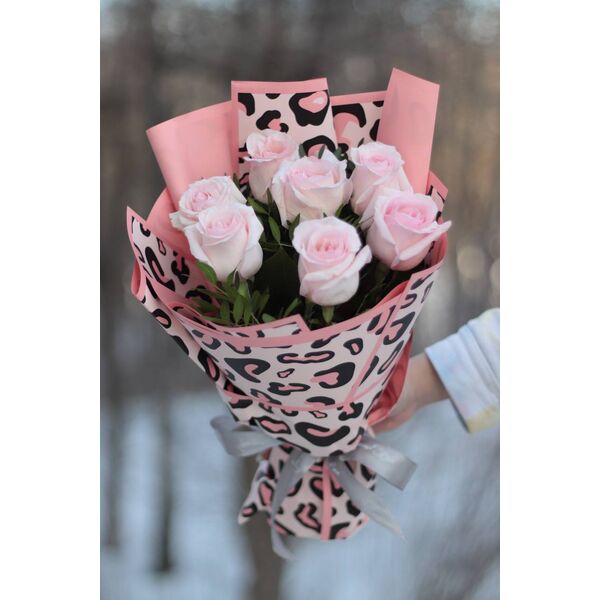 Собран букет из 7 роз с зеленью, упакован в стильную упаковку.