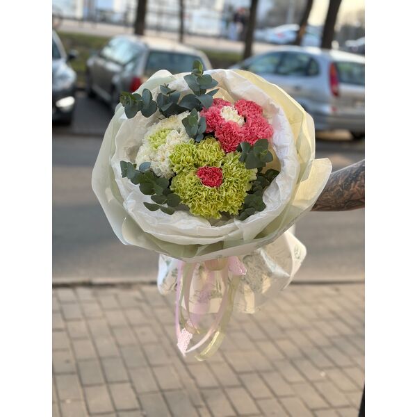Букет из диантусов и эвкалипта в стильной упаковке. Этот букет хочется разглядывать со всех сторон ✨. Наличие уточняйте у наших специалистов.