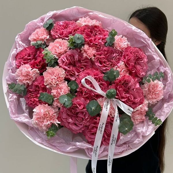 11 роз, 14 диантусов , эвкалипт , упаковка