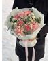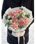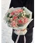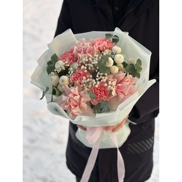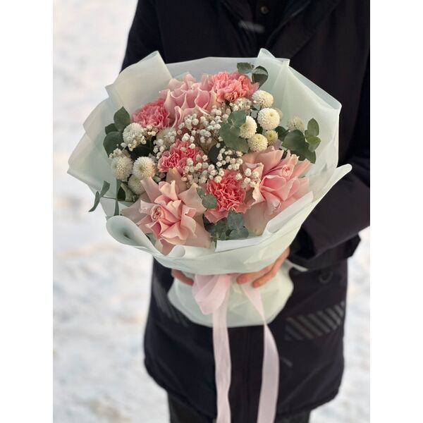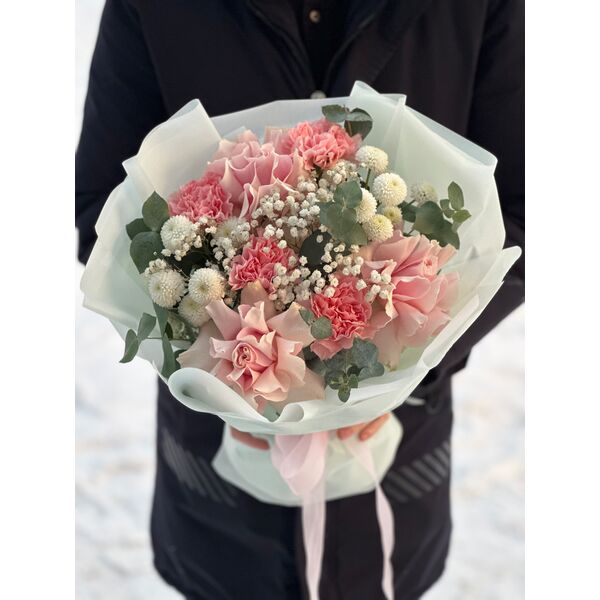 Букет собран из французских роз, диантусов, хризантемы, хамелациума и эвкалипта. Наличие и цвет уточняйте у наших специалистов.