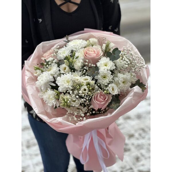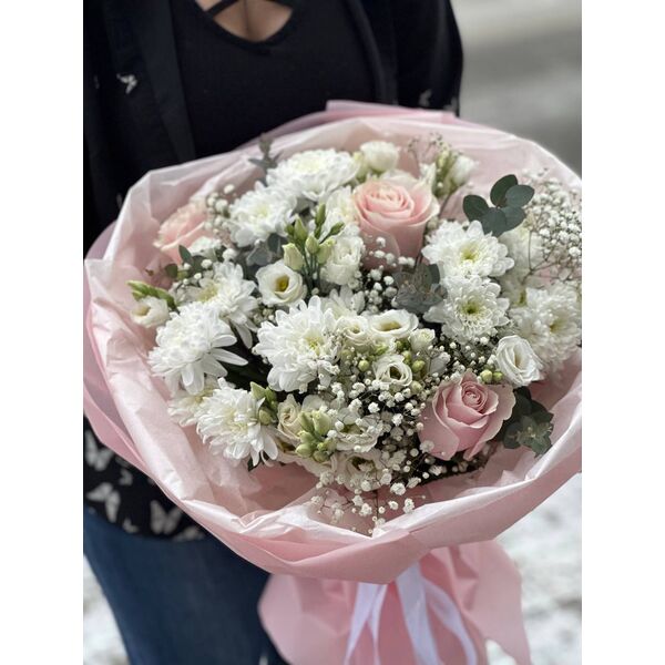 3 розы, 3 хризантемы, 2 гипсофилы, эвкалипт , 3 эустомы, упаковка.