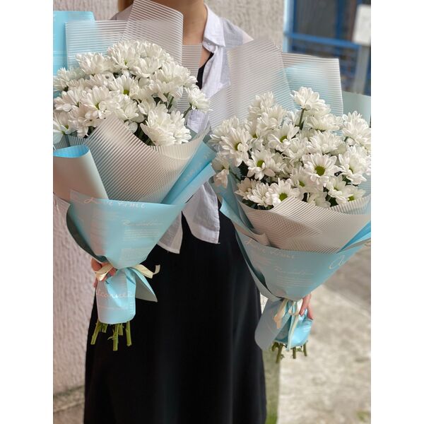 Букет состоит из 5 веток хризантемы Бокарди и упакован в корейскую плёнку.