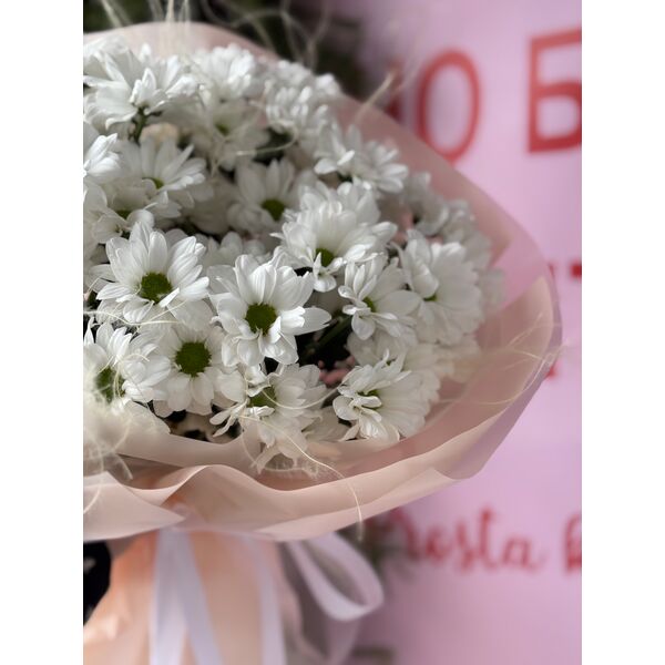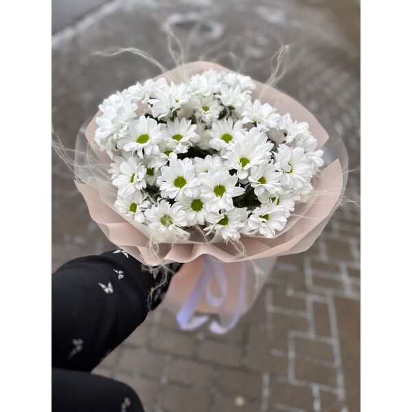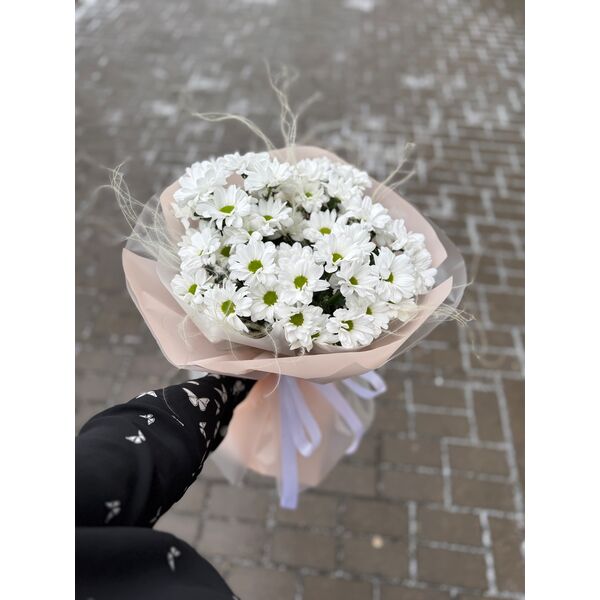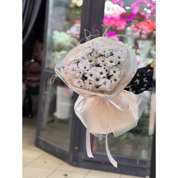 Букет из 5 белых хризантем, в стильной упаковке.