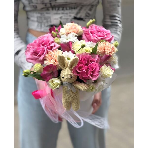 3 розы, 1 эустомы, 1 хризантема, 1 кустовая , 1 коробка ,3 диантуса , 1 зайка