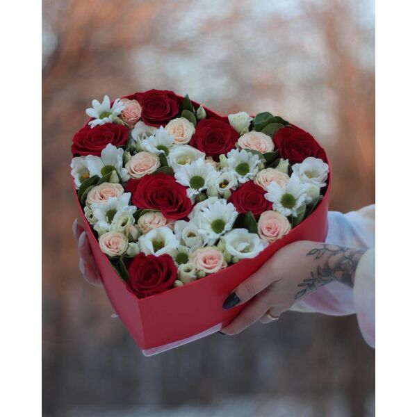 Собрана композиция в коробке в виде сердца из красной розы, кустовой розы , эустомы, хризантемы , зелени.