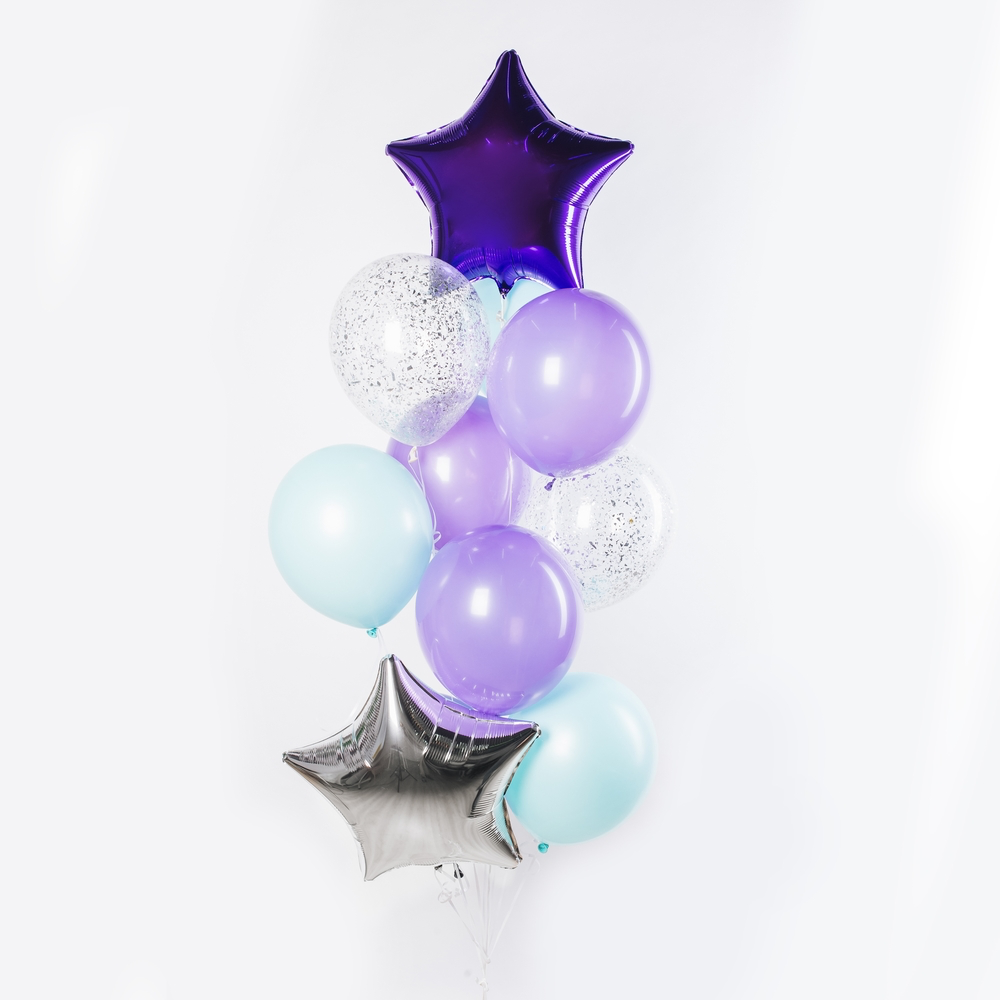 Яркий фонтан из шаров в приятном сочетании нежных тонов с добавлением красочных звезд. Отличный вариант для украшения выпускного, дня рождения, романтического свидания. В комплект входит грузик ручной работы, а специальный пакет под шары доставит их в полной сохранности.