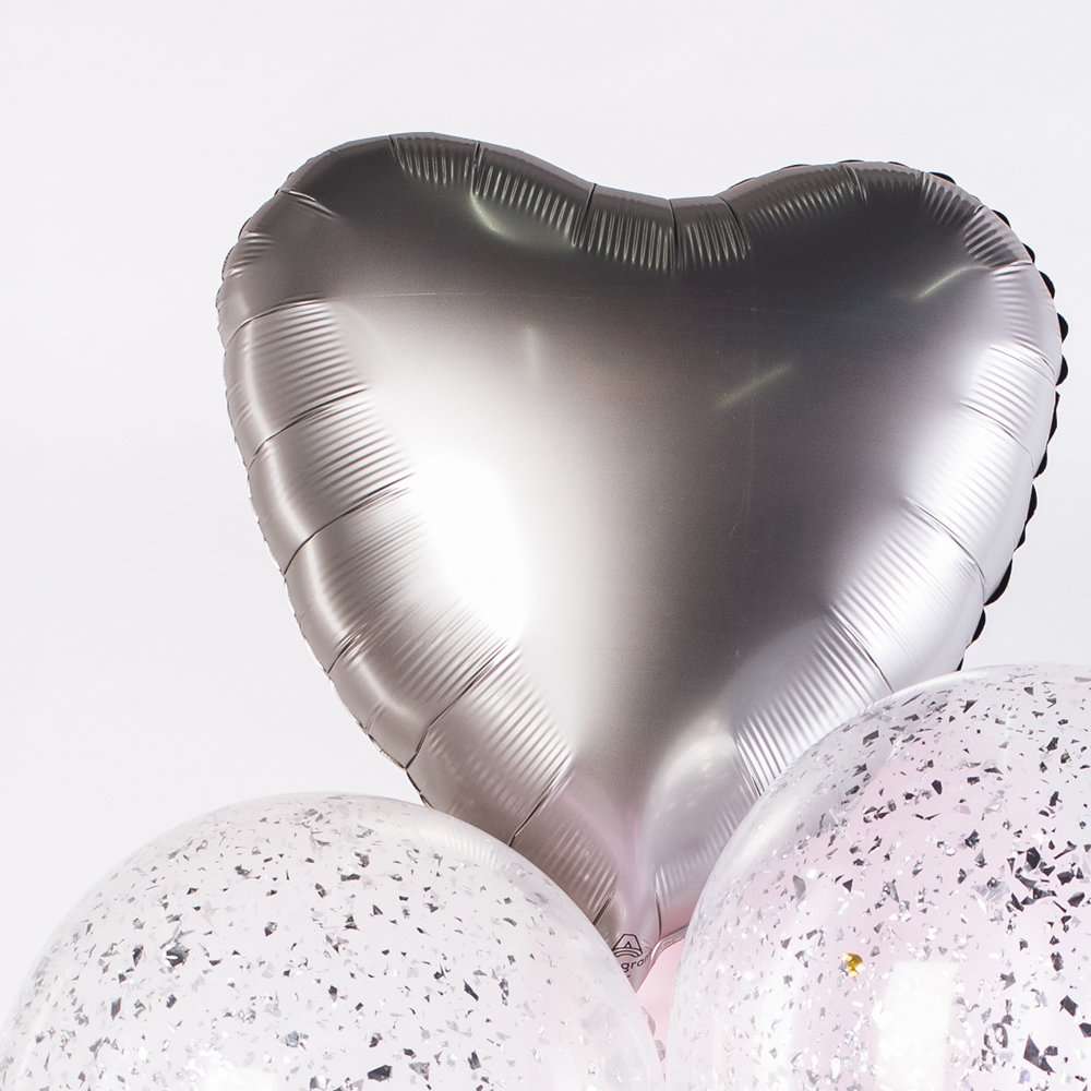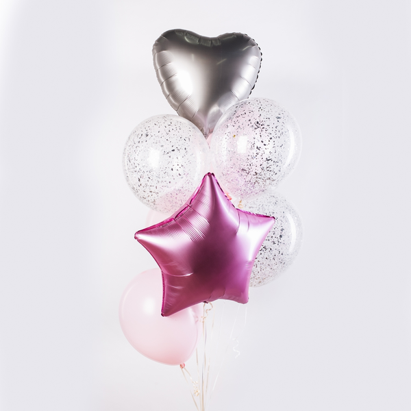 Блестит все - конфетти в шариках, звезда, сердечко…весь фонтан из гелиевых шаров просто сияет! Очень милый подарок на день рождение или при выписке из роддома. Для тех, к кому ещё не заявлялись домой с охапкой шаров в качестве сюрприза!