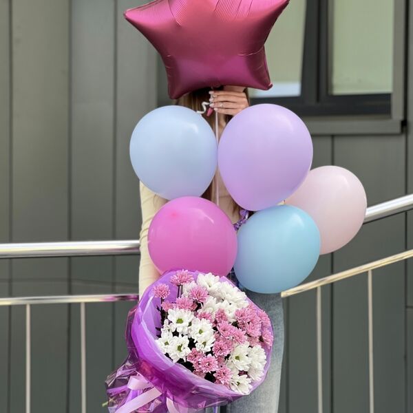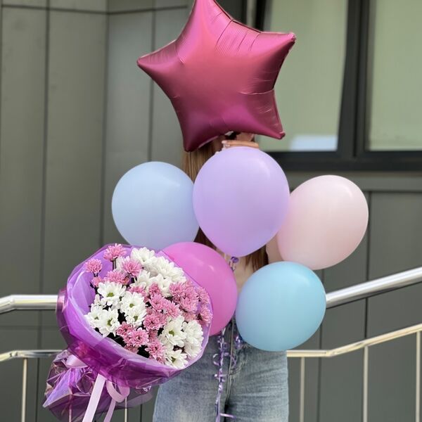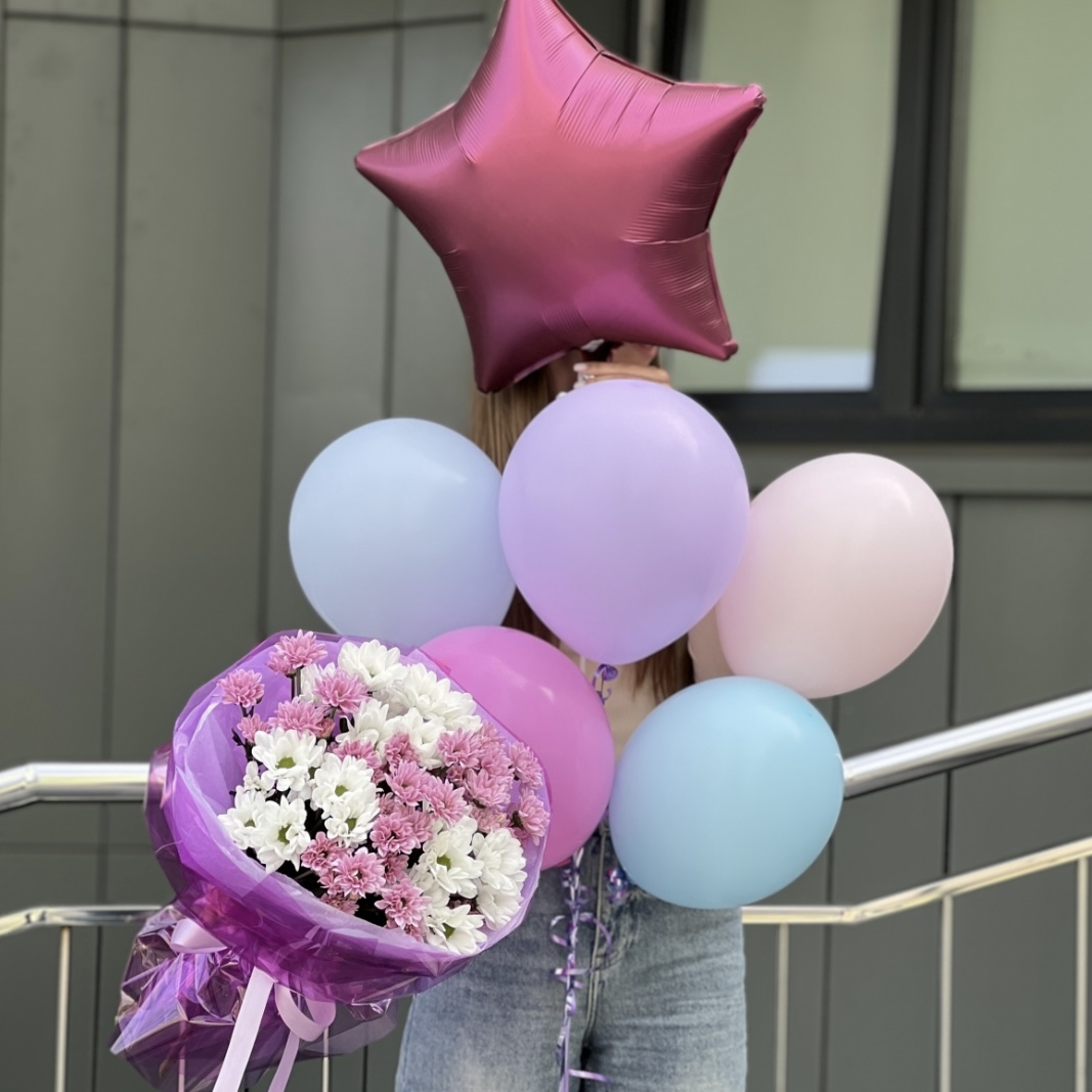 Фонтан из гелиевых шаров и букета из 7 хризантем. (Наличие и цвет шаров уточняйте у наших специалистов)
