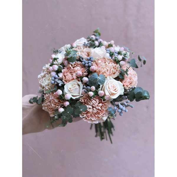 букет Невесты из розы, диантуса, гиперикума, брунии, эвкалипта